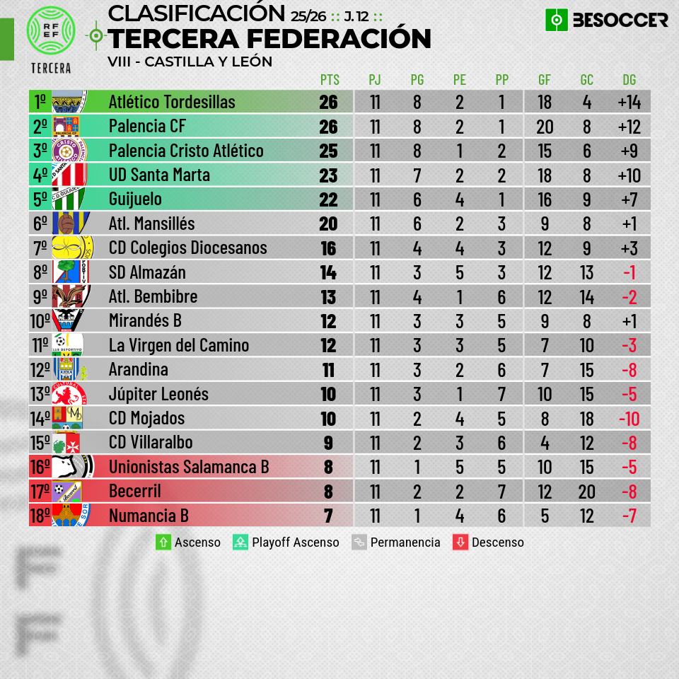A punto de alcanzarse el primer tercio del Campeonato en el Grupo VIII, los de Pablo Gil suman 11 puntos lejos de las plazas de play off que ocupaba hace un año la Arandina de Sesi Fernández con 23 puntos. Los blanquiazules reciben el sábado (16:00 h) al Atlético Mansillés que ocupa la sexta posición a un punto de los puestos de play off