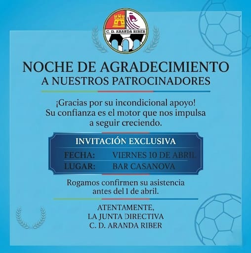 Por otro lado, este mismo viernes (20:00 h) la directiva del Aranda Riber va a llevar a cabo un encuentro con todos sus patrocinadores en Bar Casanova (Plaza de la Constitución)